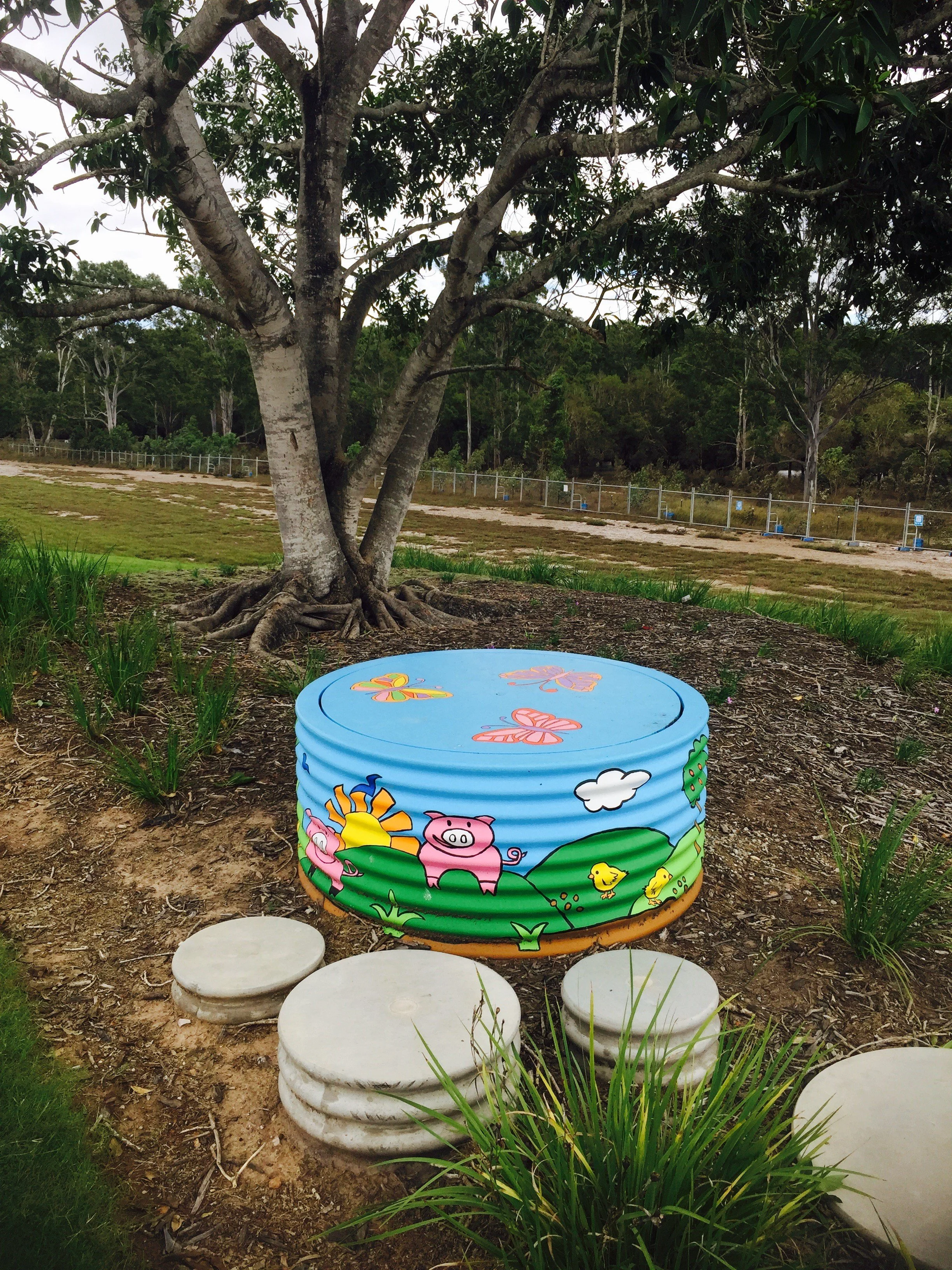 Heart & Soul Sisters Creative Experiences collaborated with LENDLEASE and the Students from Logan Village Primary to beautify the cement “Water tank” look alike seats which were placed throughout the park. The theme was Farmhouse.